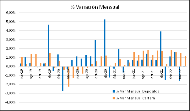 La cartera mantiene su tendencia de crecimiento, mientras que los depósitos se mantuvieron en Mayo 2022, sin embargo se mantiene alto el nivel de liquidez en sistema financiero.