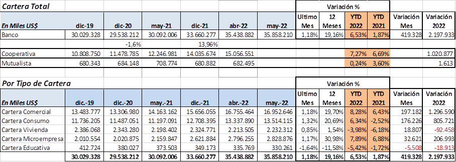 Los créditos en Mayo 2022 mantienen su tendencia positiva de últimos meses, crecieron US$ 419 millones, que representa 1.18% versus mes anterior, y 19.2% en los últimos 12 meses. Por tipo de cartera en este mes, creció Comercial US$ 197 millones, seguido de Consumo US$ 176 millones (regreso a clases en la costa), mientras que en Vivienda crecen US$ 18 millones, y Microcrédito crece US$ 33 millones.