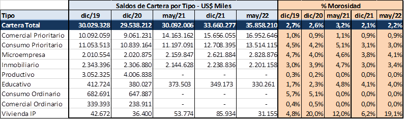 La morosidad se mantiene en Mayo 2022 en 2.2%, similar a mes anterior.