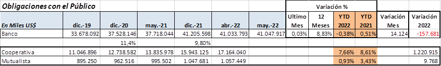 Los depósitos presentaron leve crecimiento de US$ 14 millones en Mayo 2022, manteniéndose en mismo nivel de abril, su saldo actual US$ 41,048 millones en Bancos, su variación en los últimos 12 meses es positiva 8.83%. En estos primeros 5 meses de 2022, se observa reducción de US$ 158 millones que representa -0.38%, mientras que en mismo periodo de año anterior crecieron 0.5%.